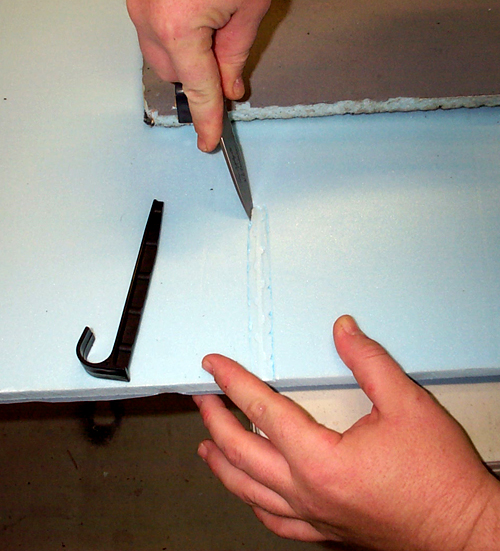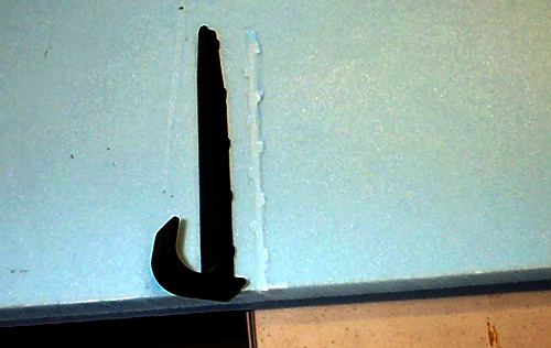 | Next, we made an angled cut into the foam. You have to make a hole large enough for both the hook and the adhesive you are using, in this case, Liquid Nails (3M 77 is inappropriate for this applicaiton). |