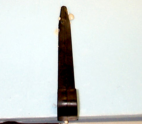 | The second angled cut form the other side of the indentation makes the Subway sandwich cut under the location of the hook. It's an angled trough into which the hook will fit. |