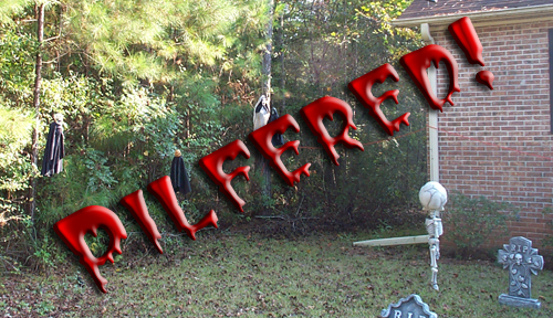 Unfortunately, some neighborhoodlums stole the Mosh Pit Monsters, including Goofy Bob, late last week. we were able to get some replacements up almost immediately, but it is still a sad day. The thing is, if these people wanted to haunt their own yard, I would gladly have given them some of my props- it's happened in the past. Oh, well. We will see what happens. |